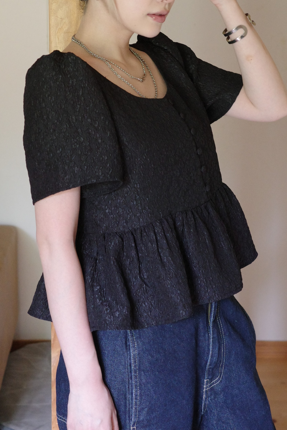 立体感のあるフラワージャガード素材が魅せる、シックでモードな一枚。