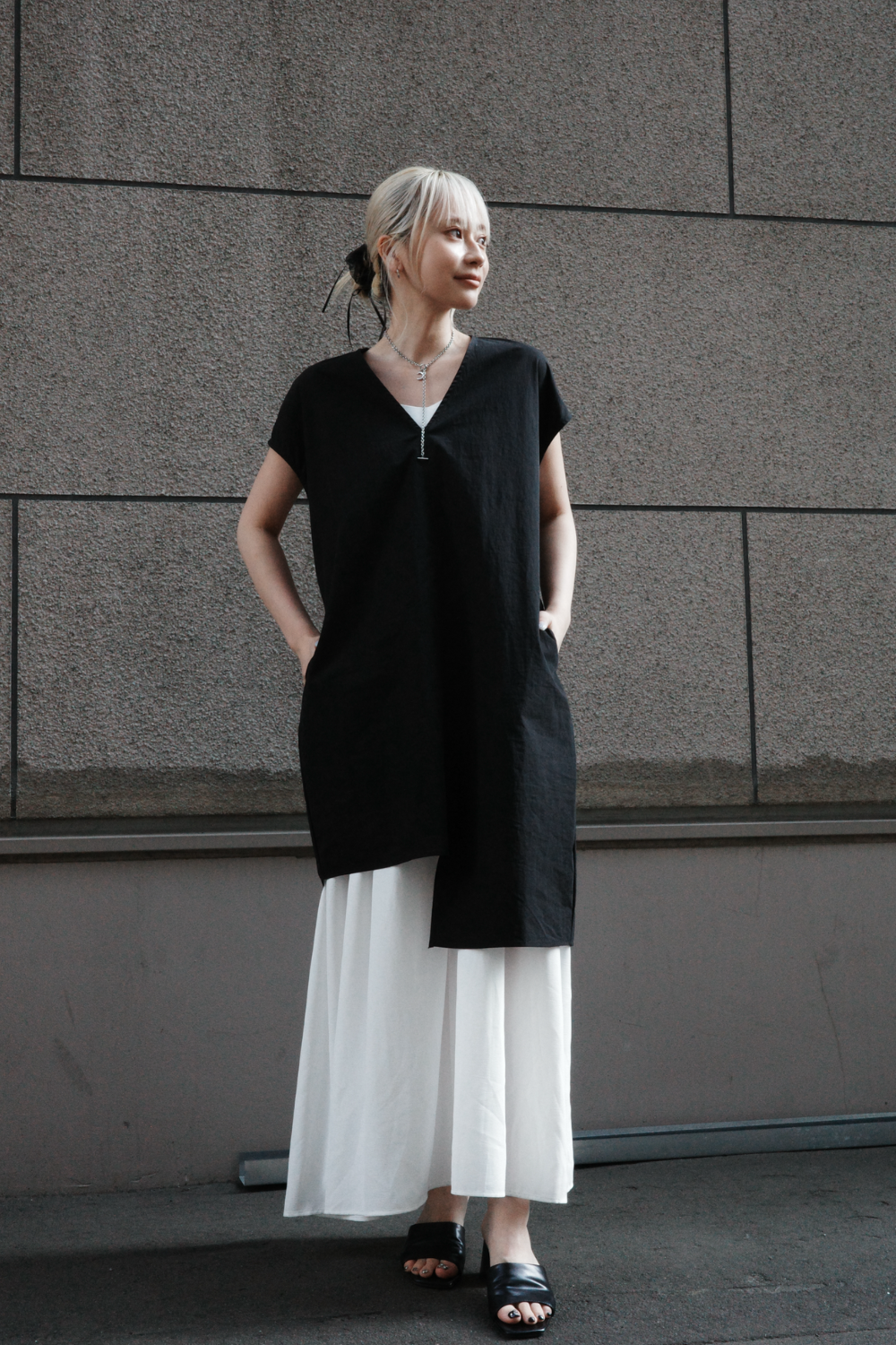 ブラックのトップスは張り感のあるコットンナイロン混素材を使用。 構築的なシルエットながら、サイドポケット付きで実用性も◎ 現状のVネックがレイヤードを省いて、